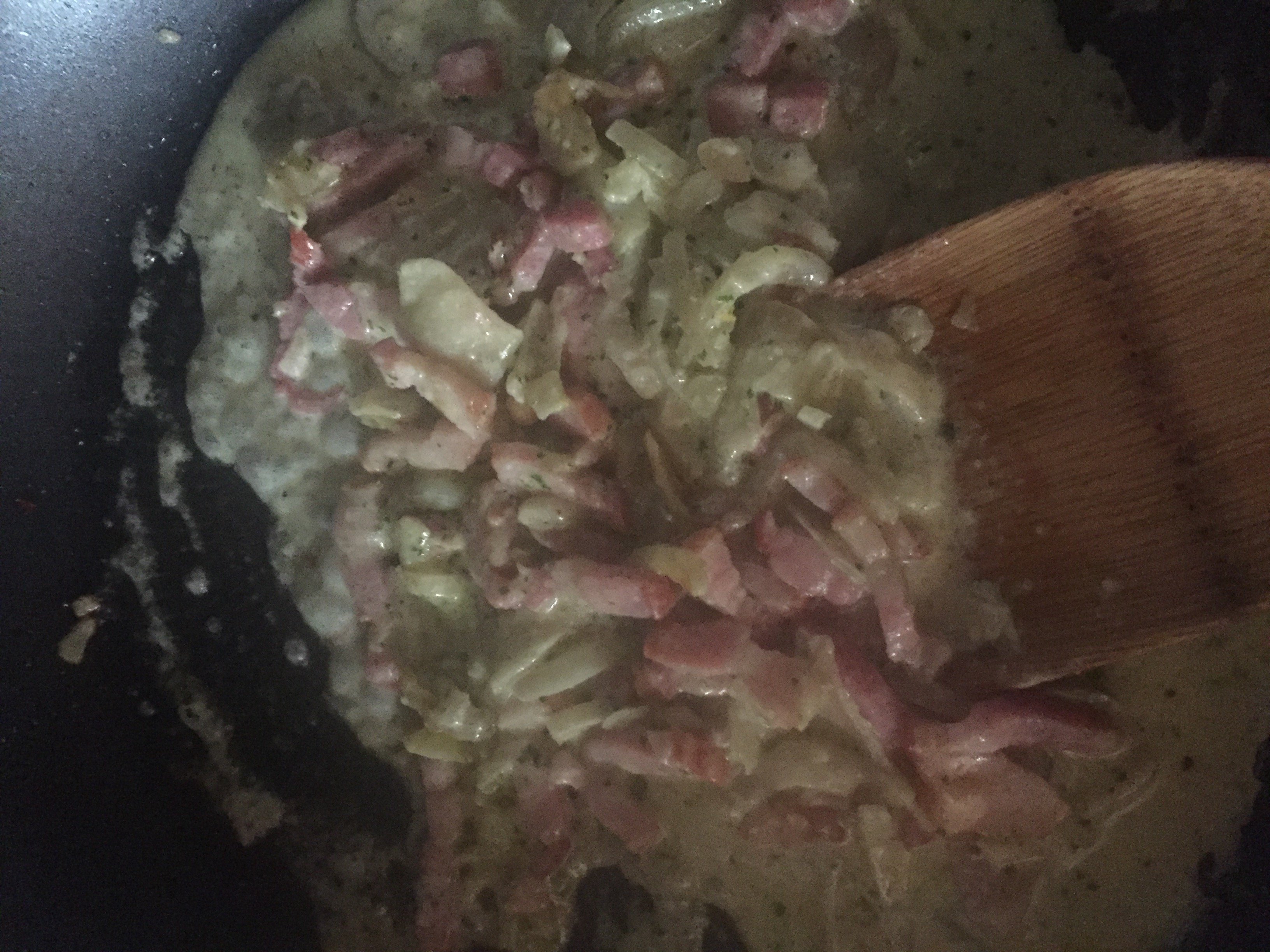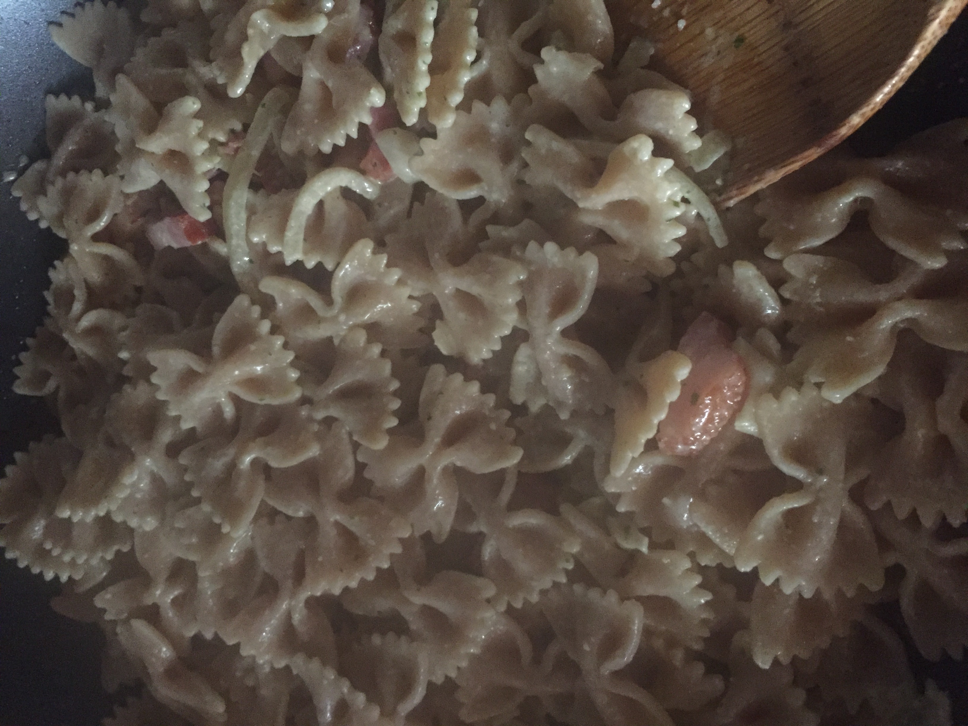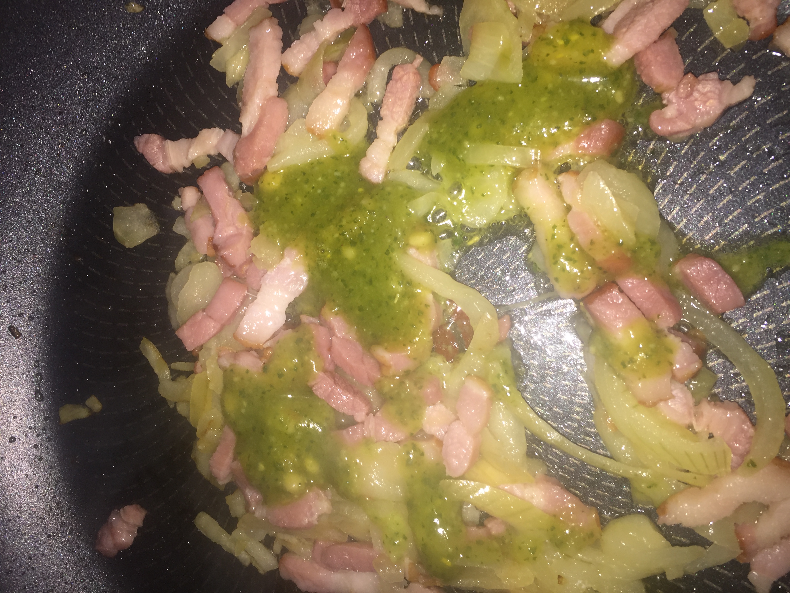 Cook the onions and bacon until fragrant, then add in some pesto. Depending on your taste, use as much as you like but I used less than half of my pesto.