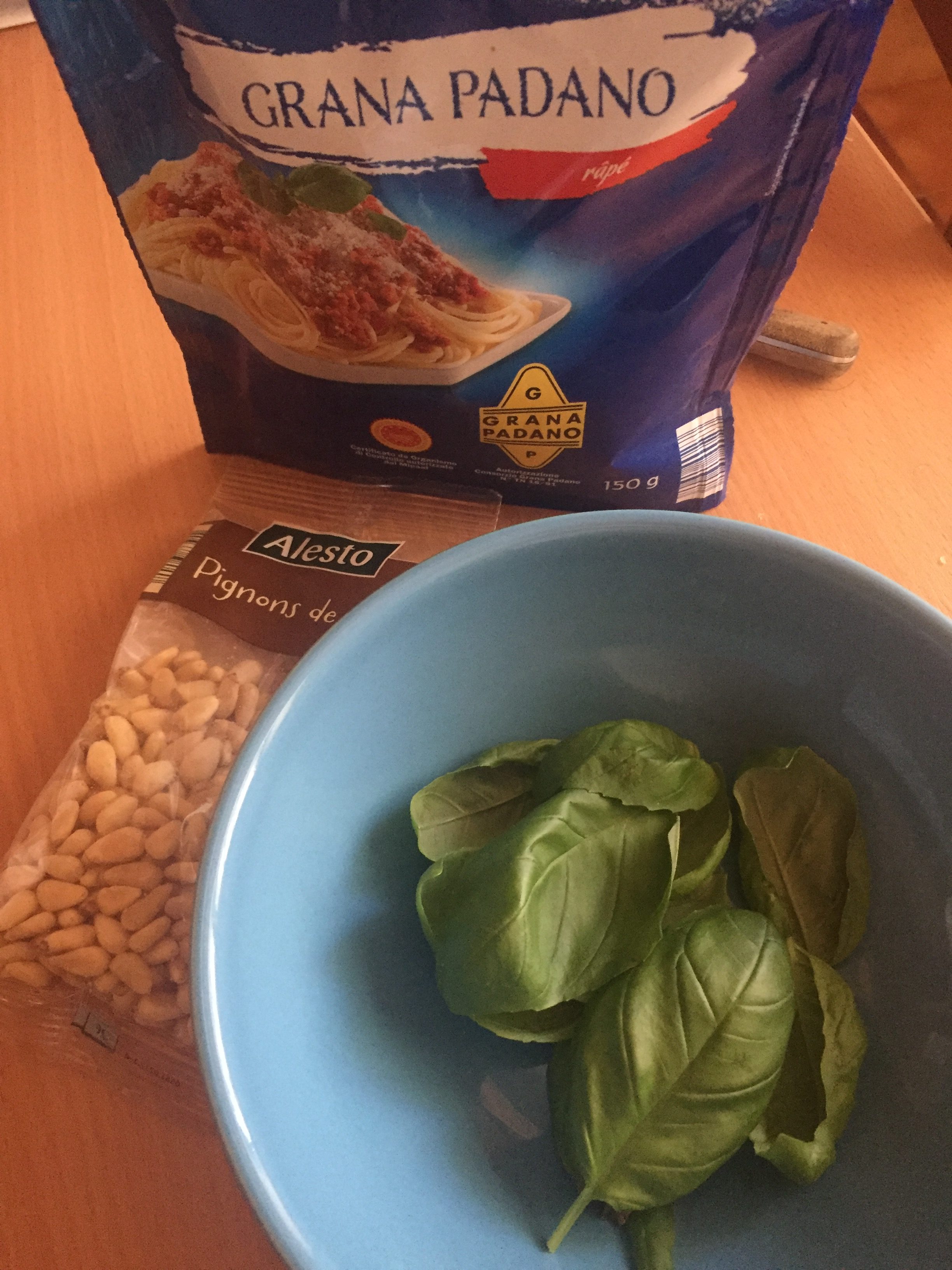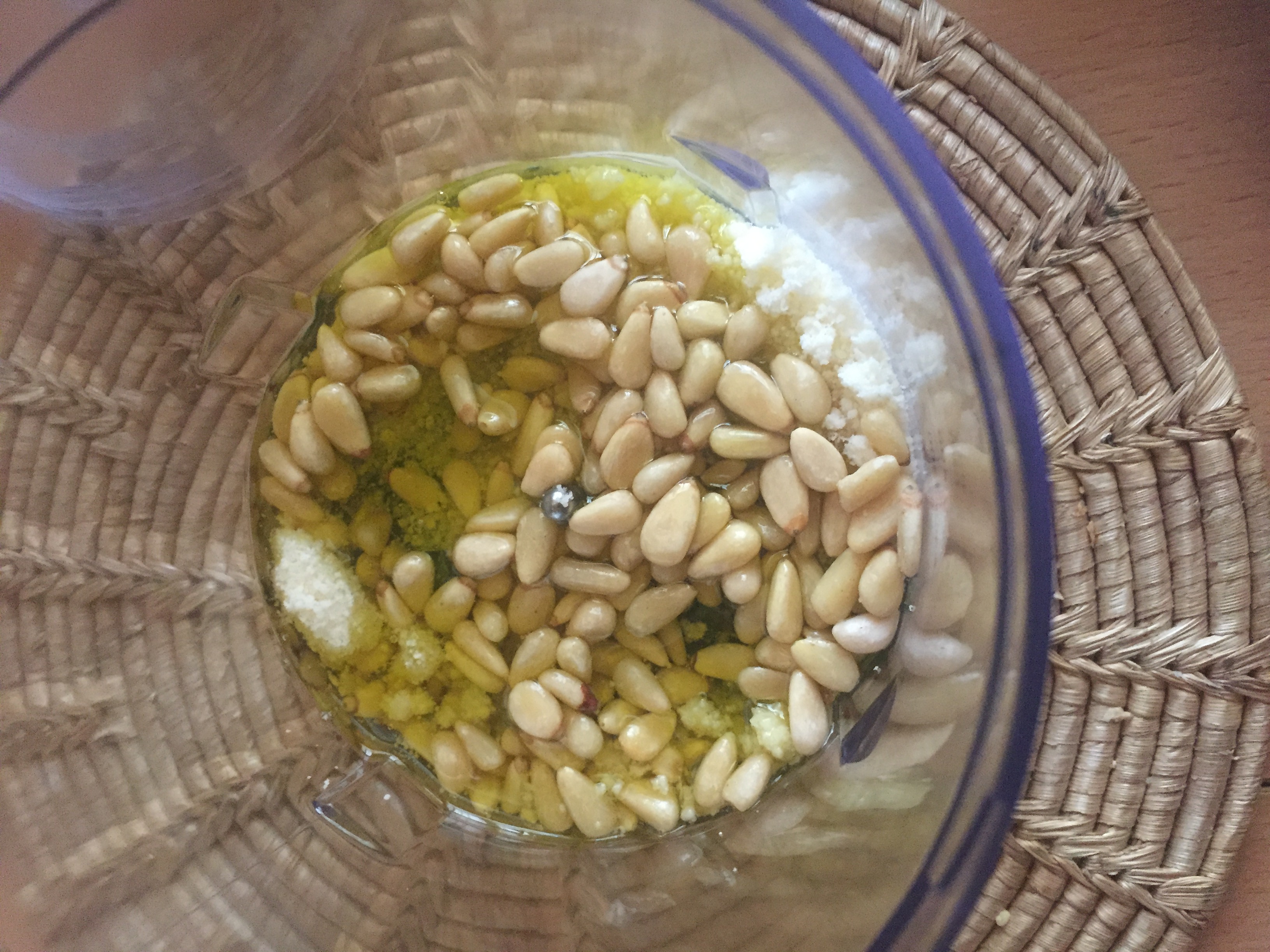 Using a blender, add in the basil, pine nuts, olive oil, garlic and parmesan. Pulse until the mixture is smooth and green.