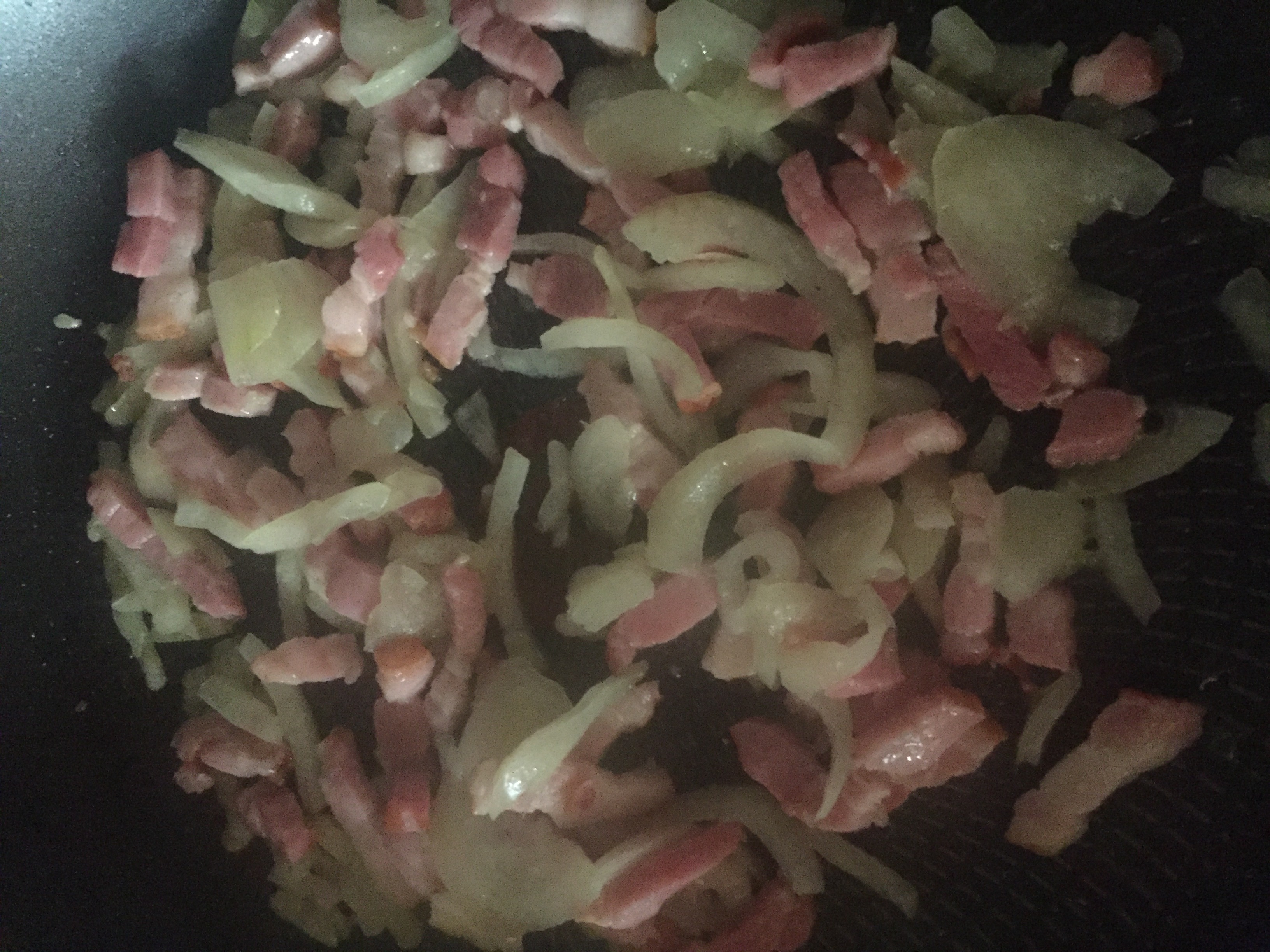 While the pasta is cooking, add a tsp of olive oil to the frying pan and heat on low-medium. Add your onions and cook for a minute or so. Then add in the bacon.