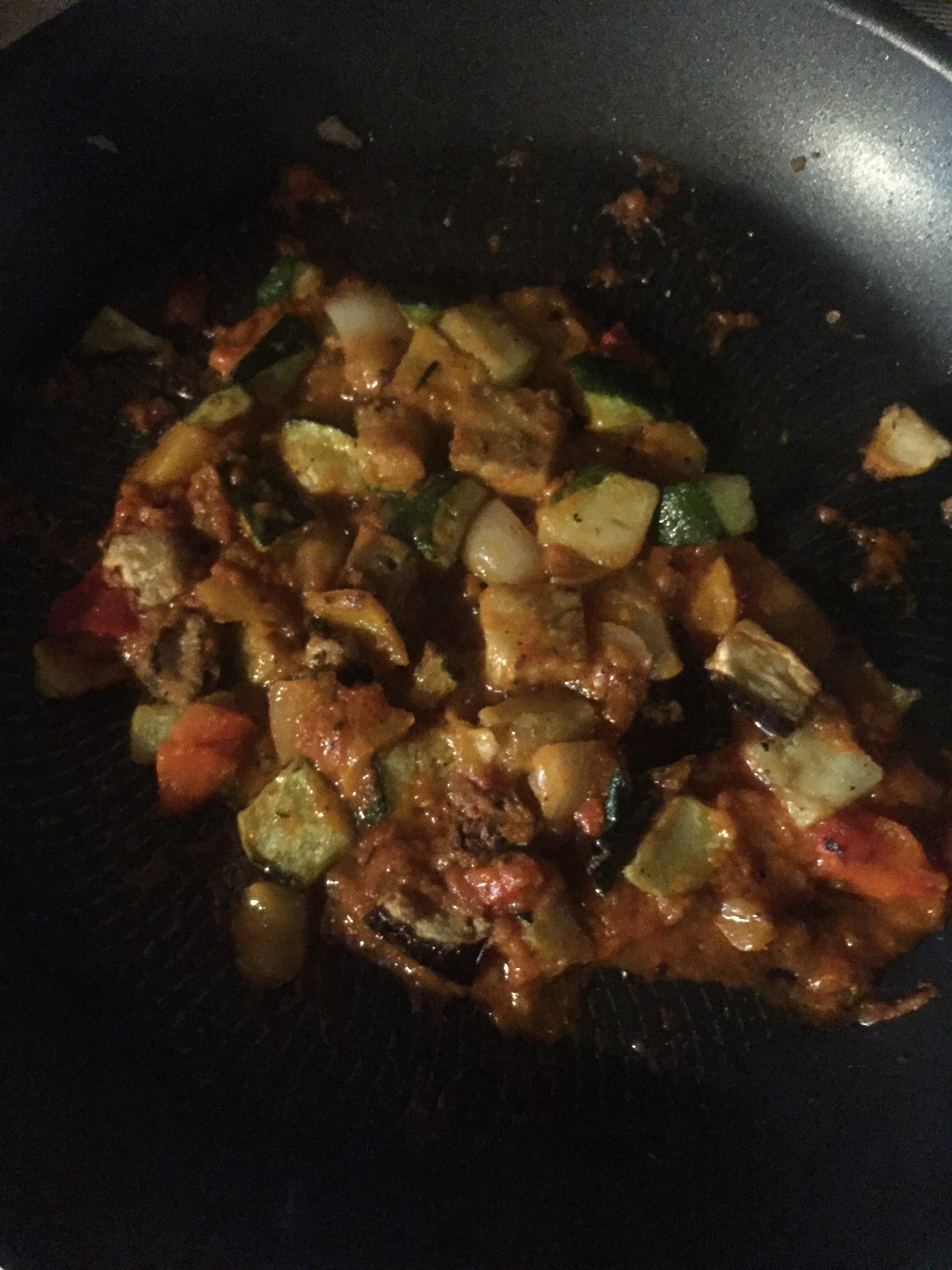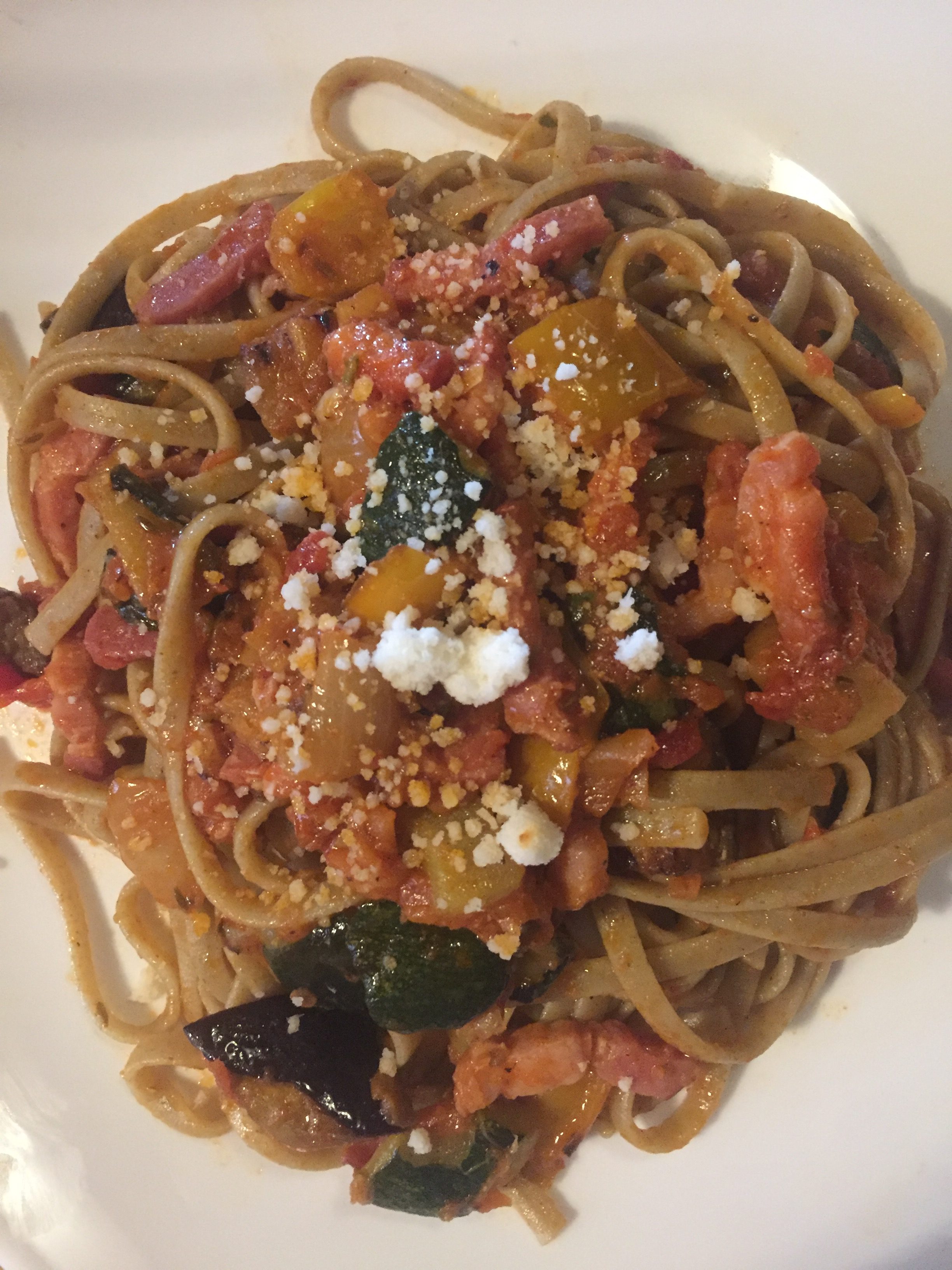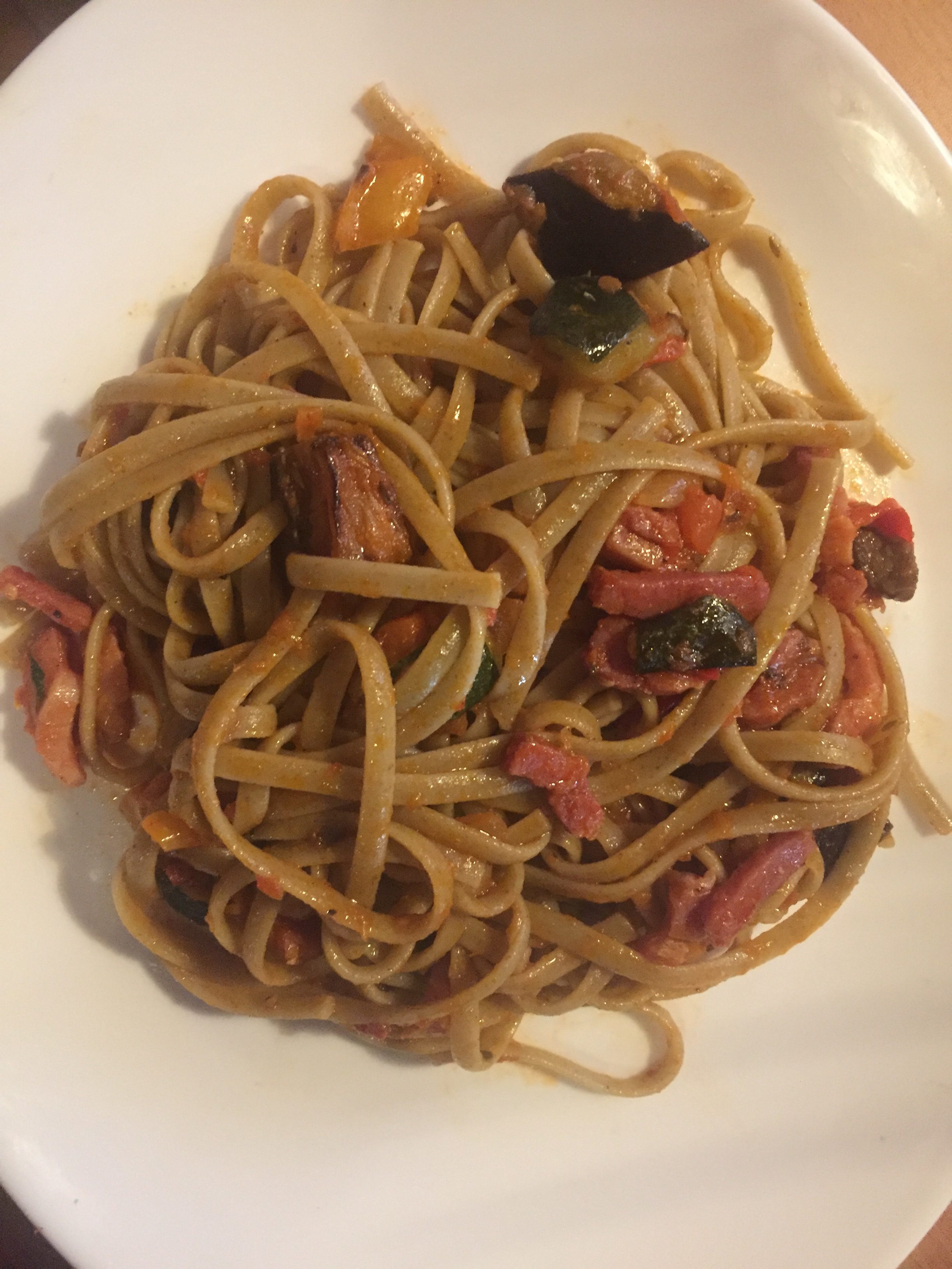 The vegetables in this dish are courgette/zucchini, aubergine and red and yellow peppers. You can cook those beforehand if you want to make this really quickly or else just start cooking those in the pan while you prepare the rest. It is tasty, filling and healthy. A great family meal. My kids even devoured it which I was surprised at since I wasnt sure they would eat the rosemary linguini or the vegetables!