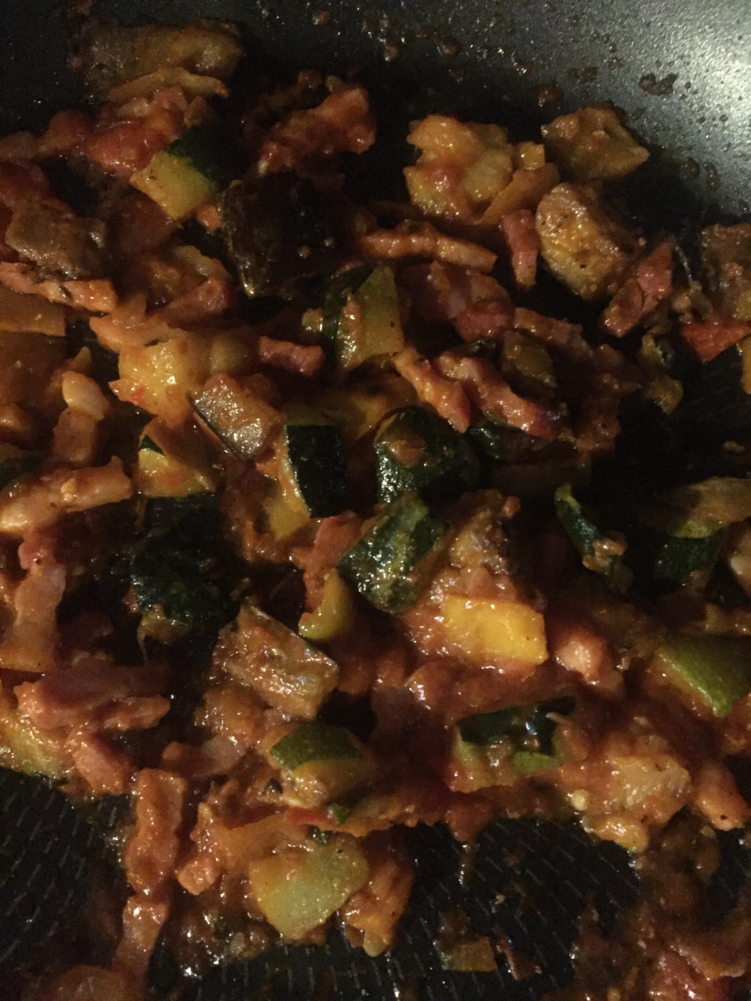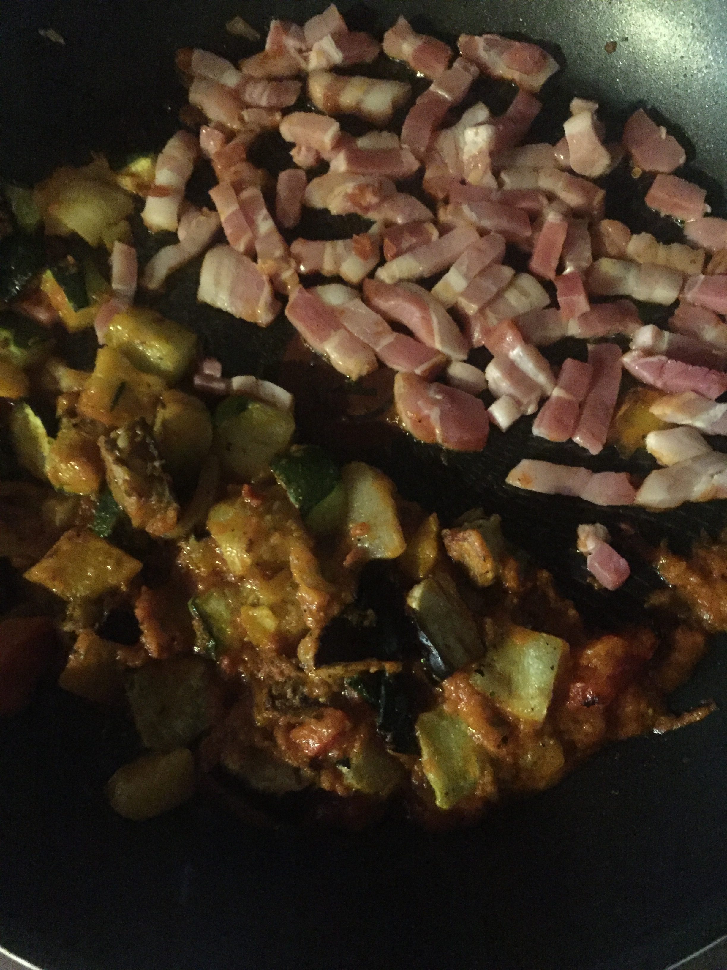 Set aside the veg in the pan or remove altogether. Cook the bacon in the pan and add in the pasta sauce. Now mix in the vegetables.