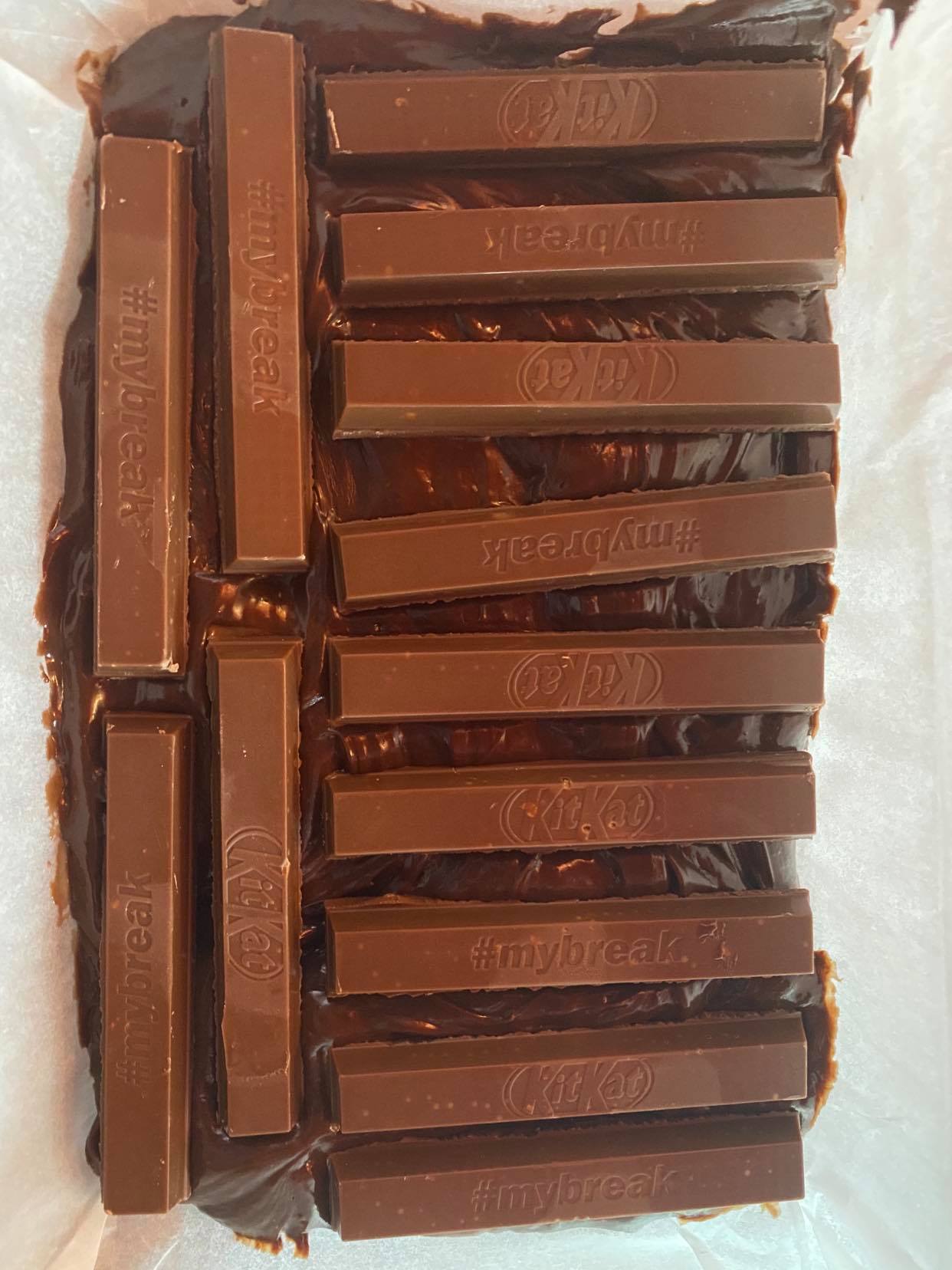 Pour half the mixture into the prepared baking dish. Now place the kit Kat fingers, slightly spaced along the top of the mixture. Pour on the remaining chocolate mixture to cover.
