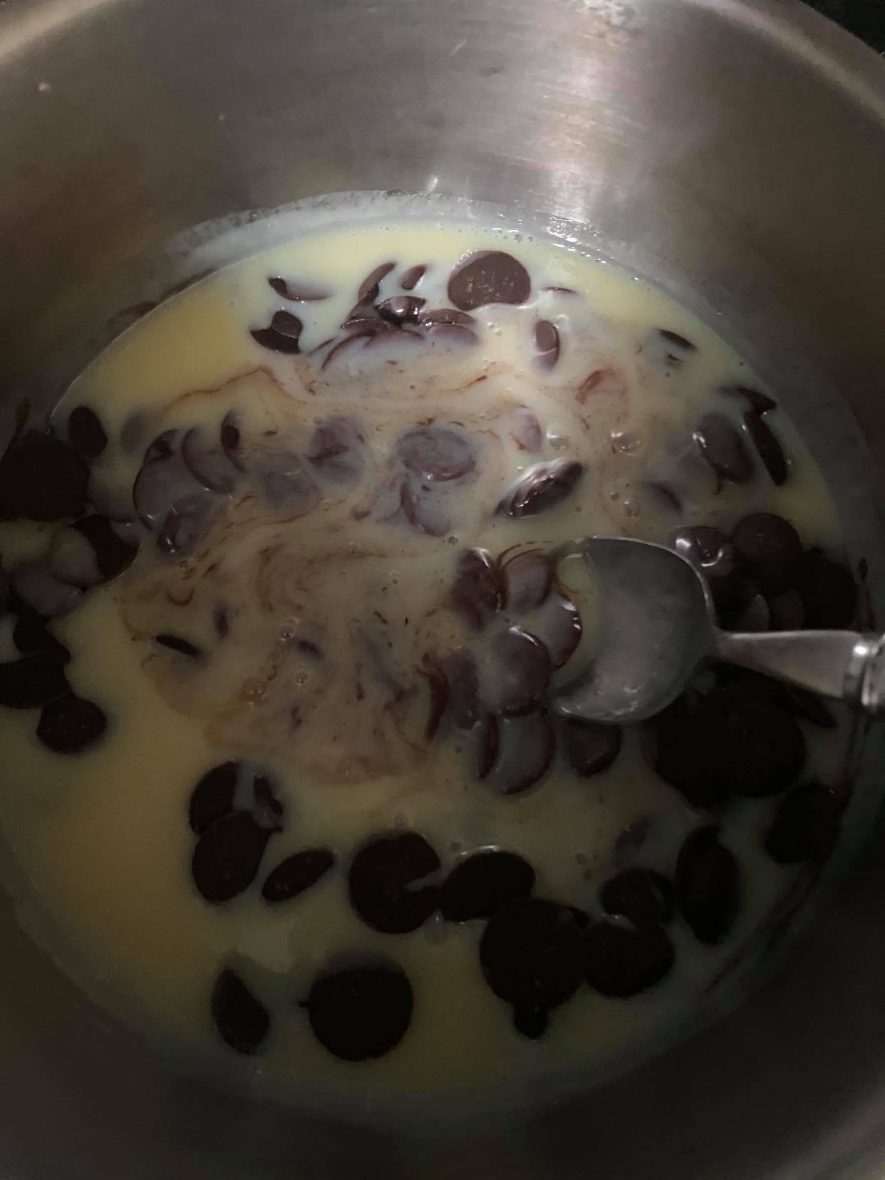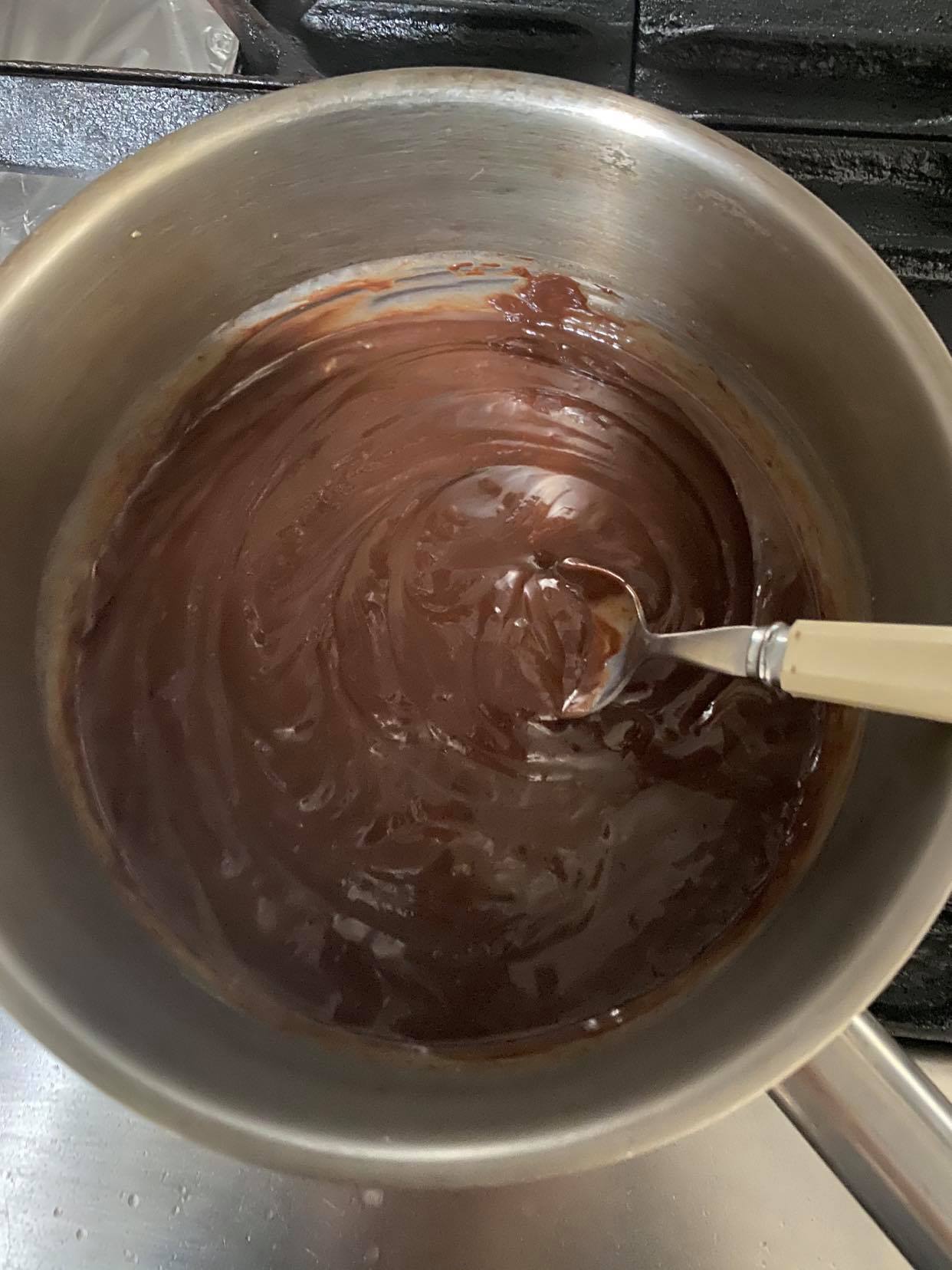 Once combined, add in your chocolate and stir well. Remove from the heat and finish combining the chocolate.