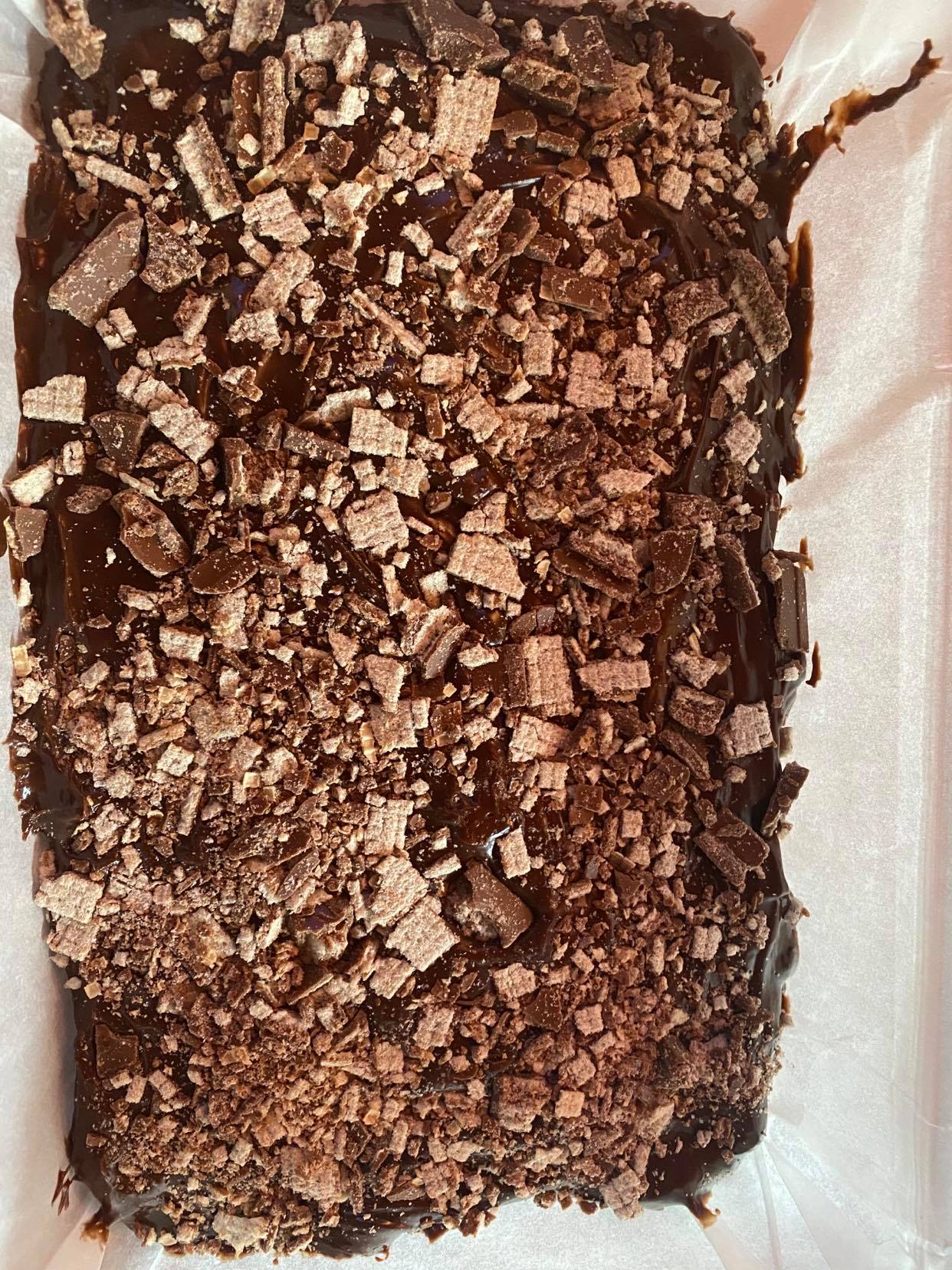 With the remaining Kit Kat, chop into a crumbly mixture to sprinkle all across the top of the fudge mixture.